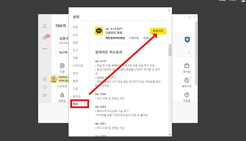 2. 설정 화면에서 정보를 누르고 업데이트 버튼을 클릭해서 카카오톡 최신버전 업데이트를 진행합니다.